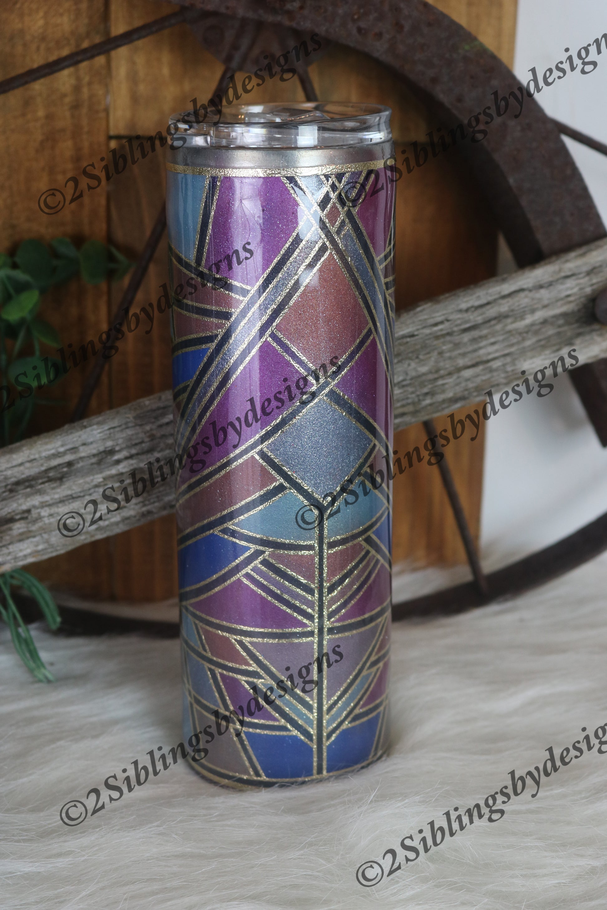 Elevate your everyday sipping with this stunning Shadow Glass tumbler. Featuring a shimmering mix of purples, blues, and bronze tones, the sleek geometric design is accented with metallic gold lines that catch the light beautifully. Its modern, art-deco style gives it a classy yet bold look, perfect for making a statement wherever you go. Durable, stylish, and functional, this tumbler is ideal for keeping your drinks hot or cold while showing off your chic sense of style.